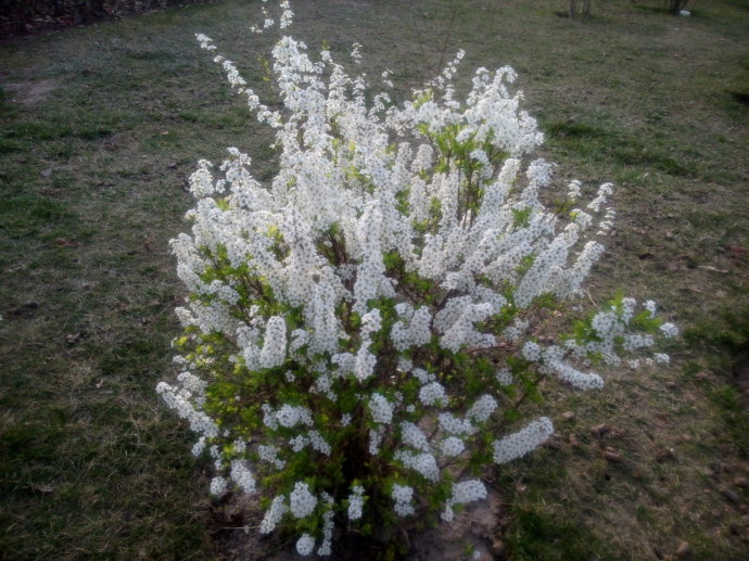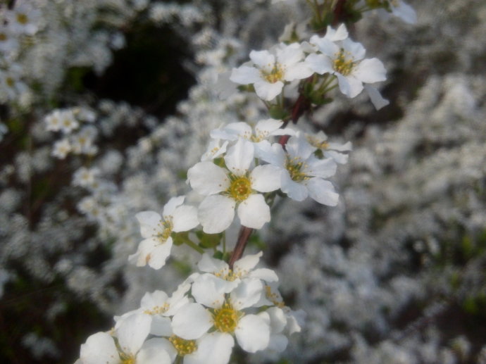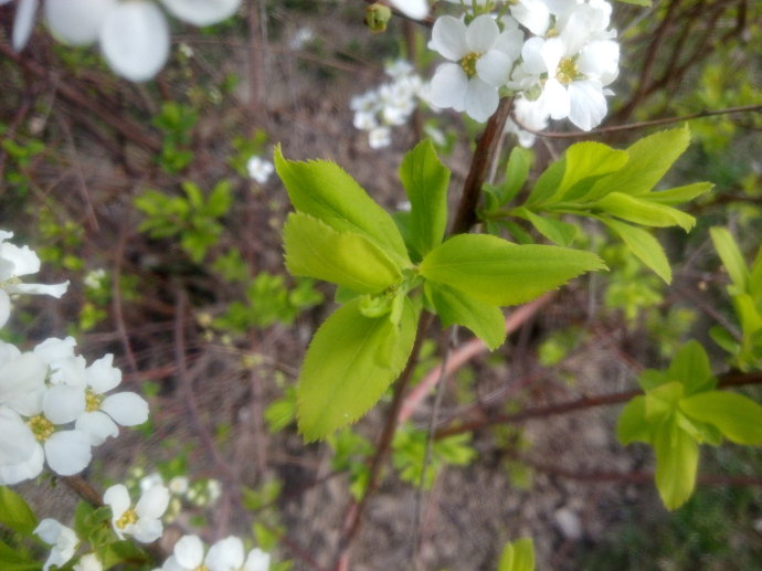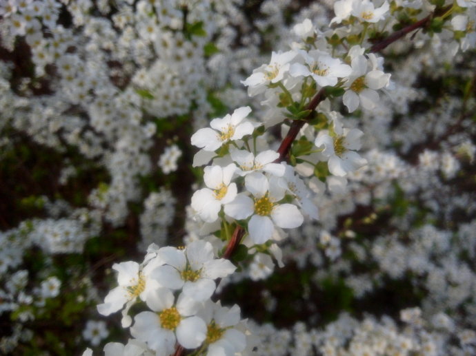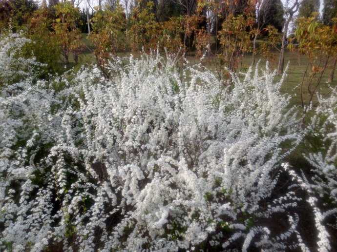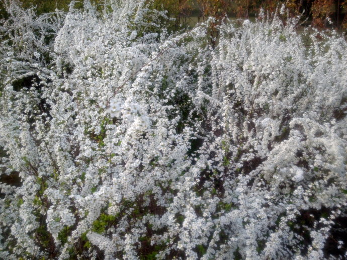 一直喜歡叫它噴雪花,而不是珍珠繡線菊什么的,它是開在萬紫千紅的春天里最熱鬧的時刻,這個時候,第一撥兒的梅花呀、玉蘭呀、杏花呀、紅葉李呀什么的已經(jīng)開過去了,金鐘呀,連翹呀,還有各種的桃花、梨花、榆葉梅、海棠花……趕著趟地?fù)頂D過來,如T臺上的選美大賽,亂哄哄的,只顧著爭奇斗艷。放眼一望,滿天滿地都是花紅柳綠,姹紫千紅,任憑你趔趄著腿兒使勁地趕著趟,眨巴著眼睛使勁地東張西望也是看不過來了,這個時候,噴雪花開了,如白雪壓枝,一片一片的,開在和煦的春風(fēng)里,這是陽春里的白雪呀,那份高潔和簡約,是另類的驚艷,唬得鬧嚷嚷的百花全都噤了聲……
