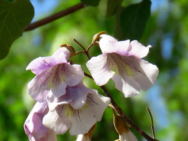 泡桐是喜光樹種,不耐蔭、不耐水澇,泡桐的萌蘗能力喲、生長速度極快,樹型高大,可達27米;樹皮灰褐色、平滑、有突起的皮孔,小枝粗壯,中空,幼時密生白色絨毛,后漸脫落。單葉對生,有時三葉輪生;葉大,卵形或長橢圓形,基部心臟形,葉背密生灰白色絨毛,全緣或微呈波狀;3~4月先葉開花,圓錐狀聚傘花序,大型花冠乳白色,內(nèi)有紫斑,有香氣;蒴果長圓有尖,較大,果熟期9~10月,種子小而薄,有翅。